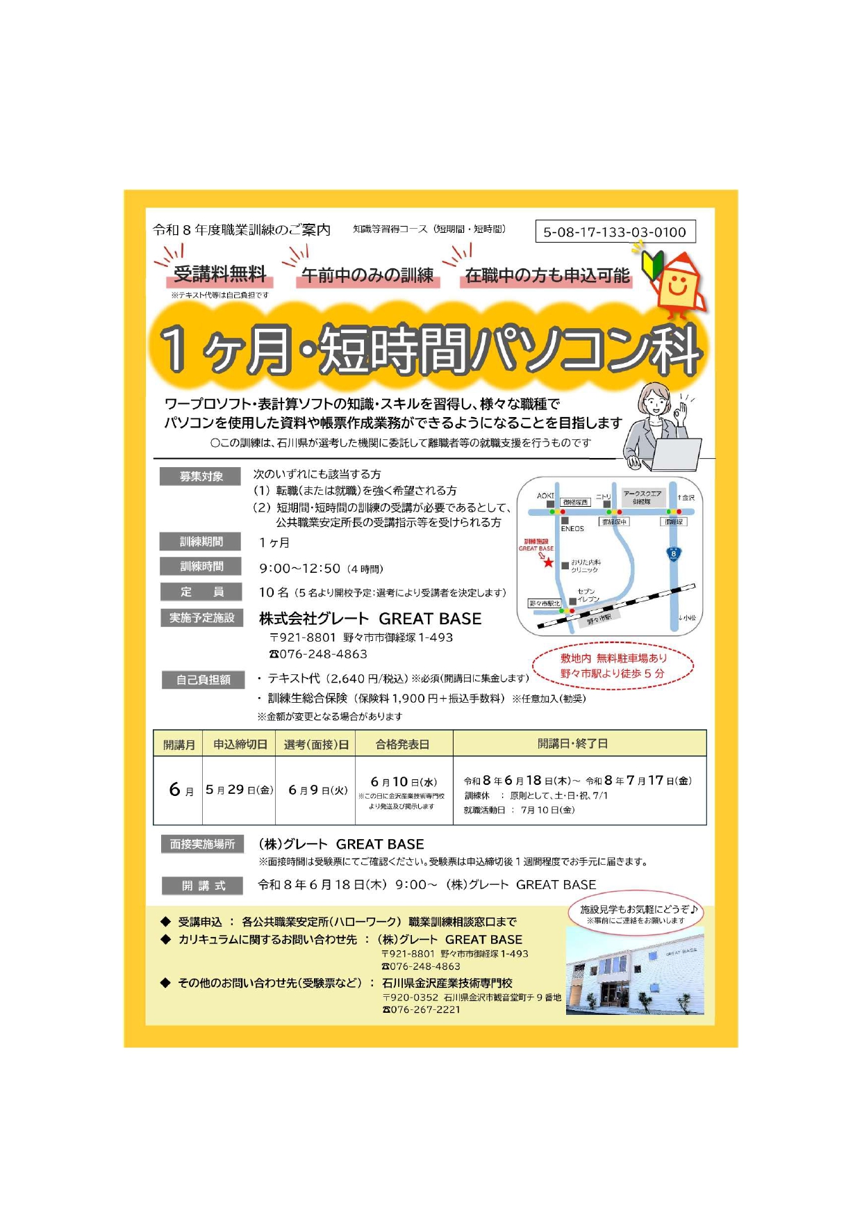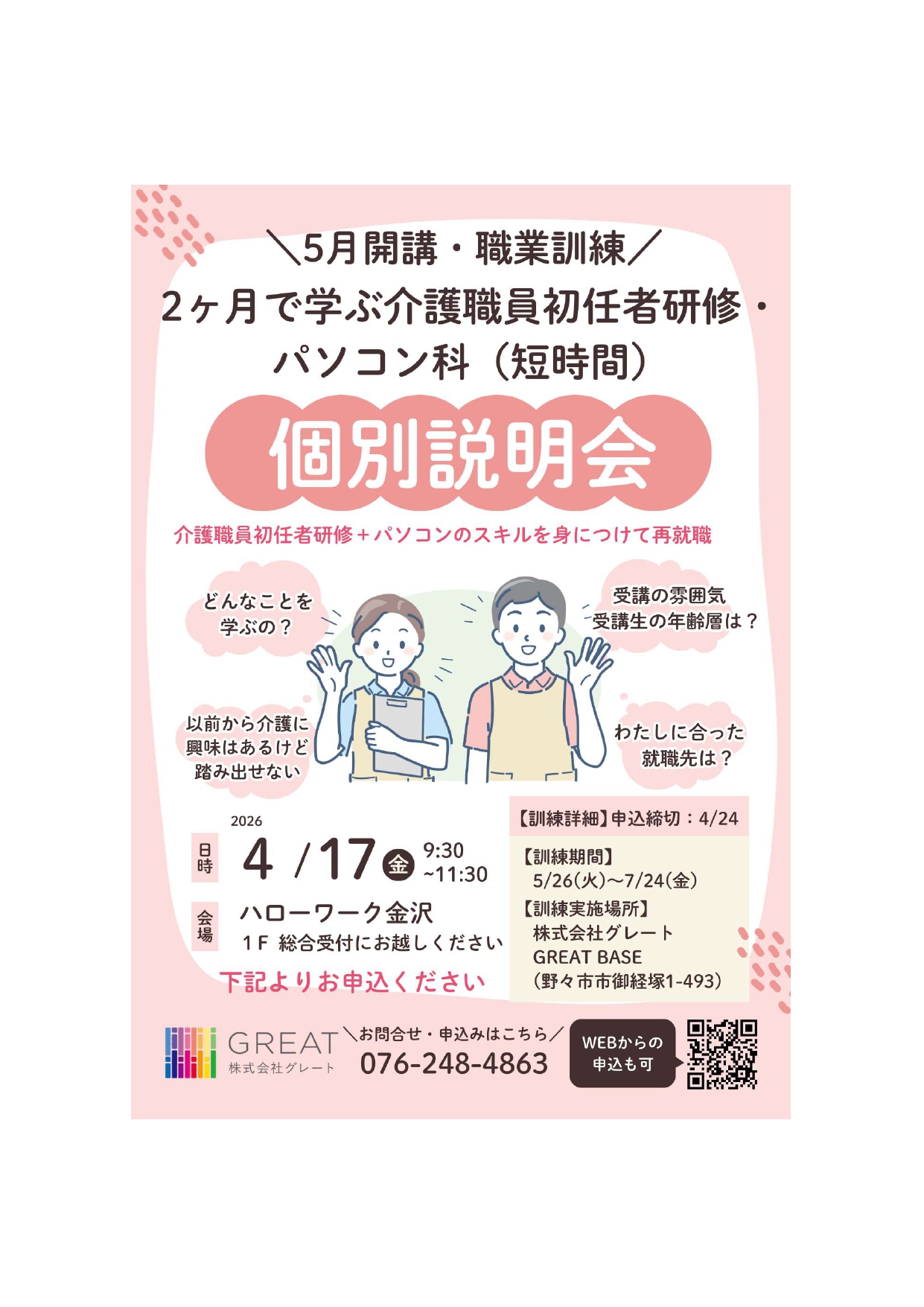 2ヶ月で学ぶ介護職員初任者研修・パソコン科(職業訓練)の個別説明会を開催します🔰 場所:ハローワーク金沢 1階 日時:4月17日(金)9:30~11:30 個別にて、訓練の詳細をお伝えさせていただきます(20分程度を予定...