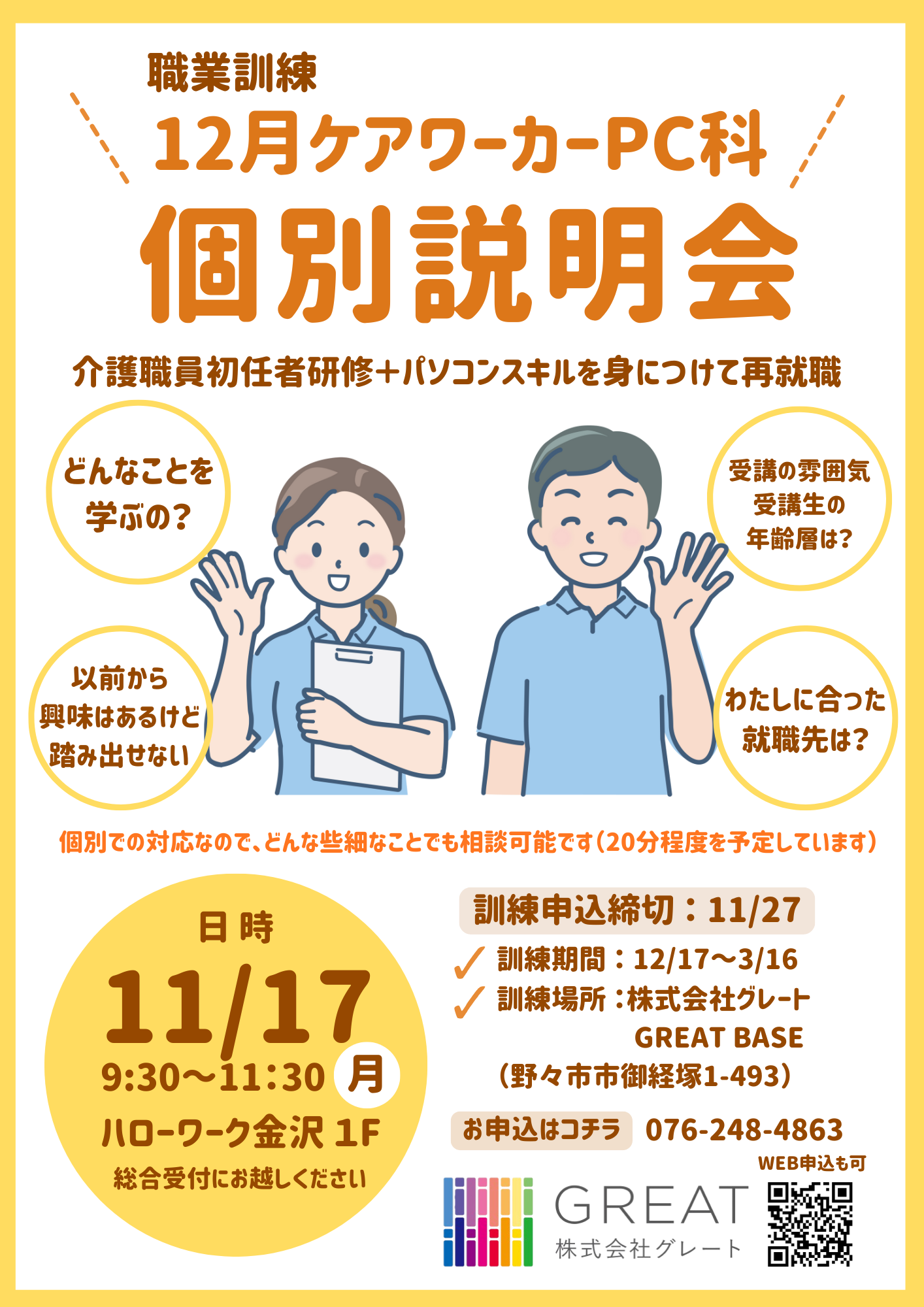 12月ケアワーカーPC科(職業訓練)の個別説明会を開催します🔰