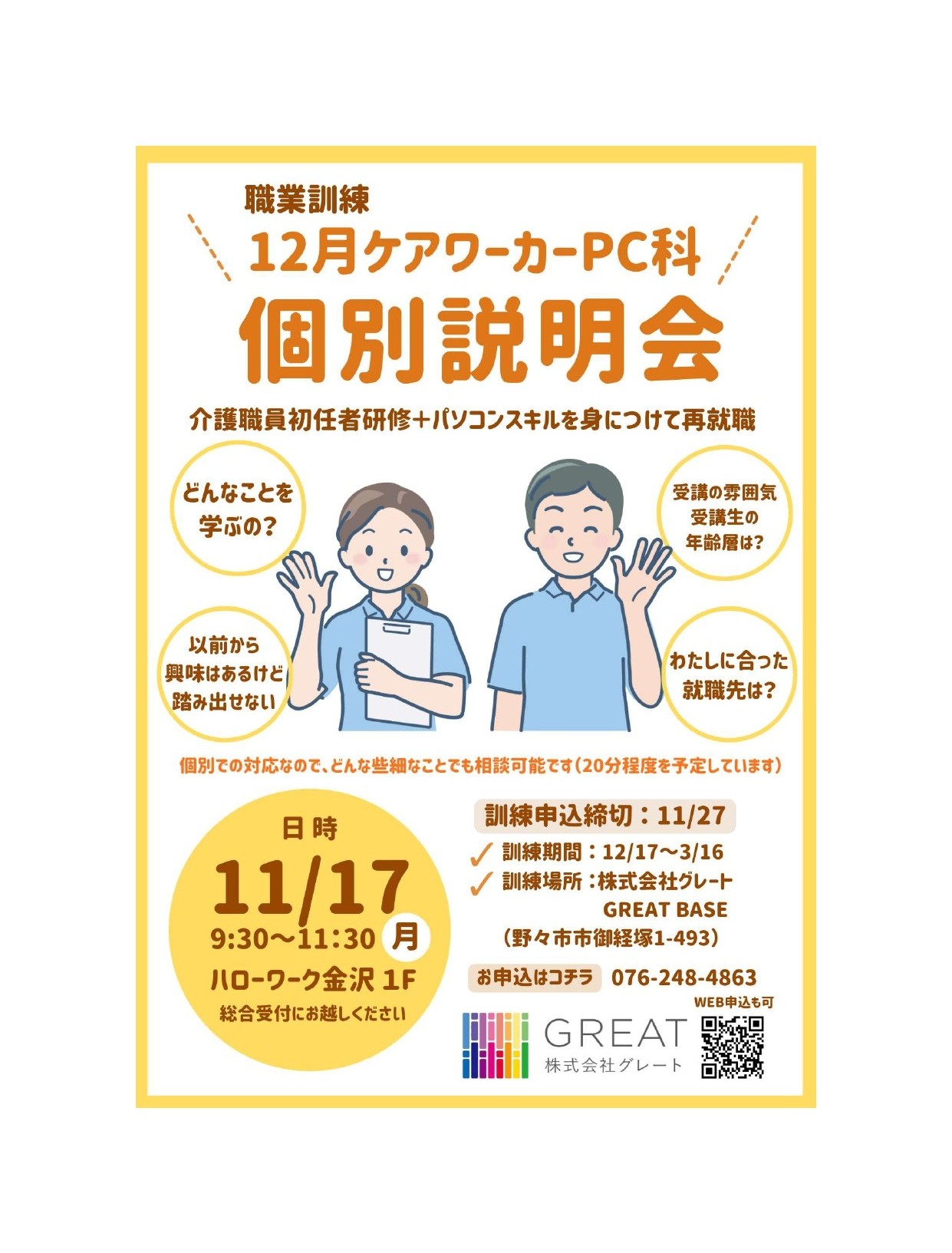 石川県『個別説明会』開催 12月ケアワーカーPC科(職業訓練)