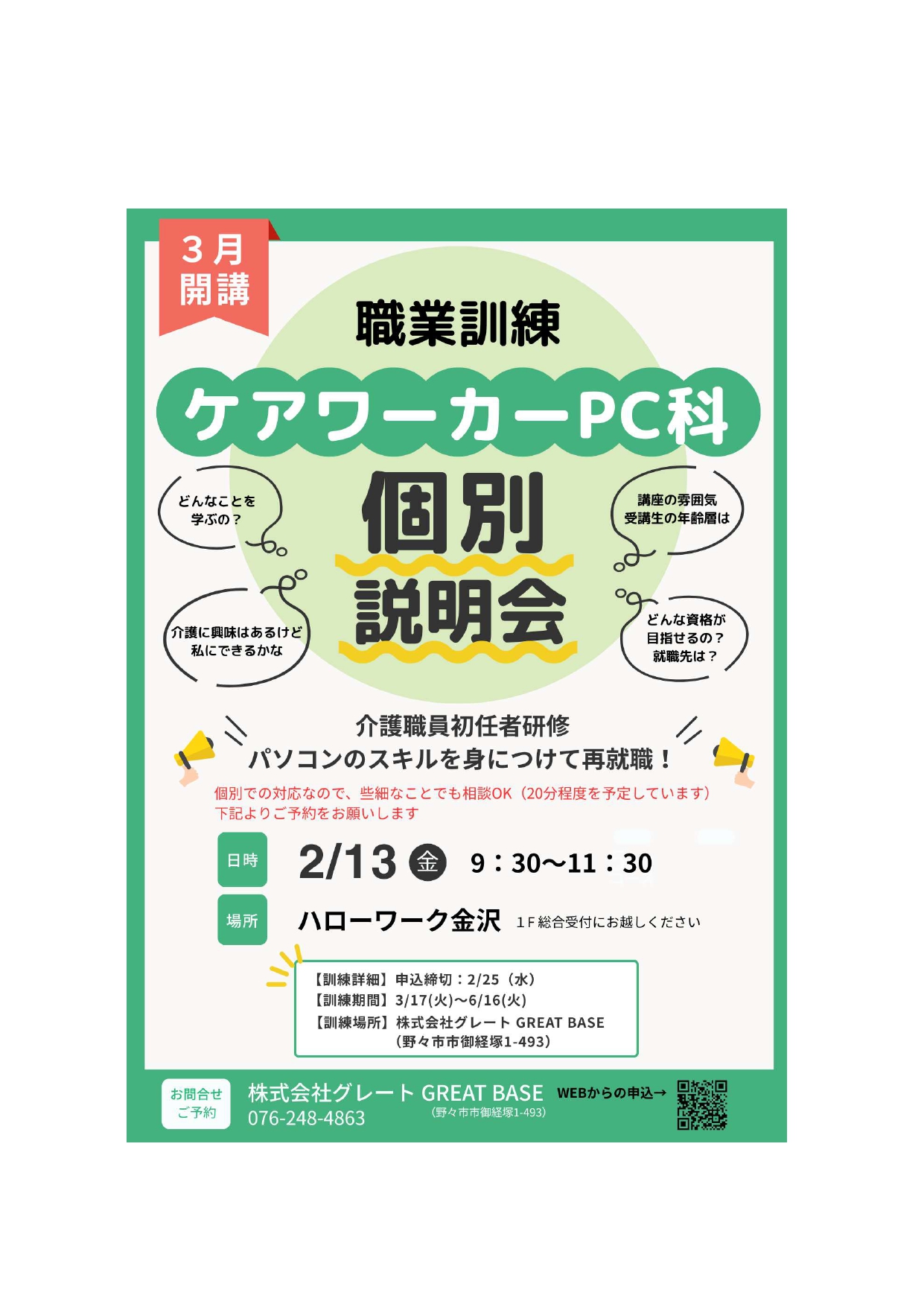 石川県『個別説明会』開催 3月ケアワーカーPC科(職業訓練)